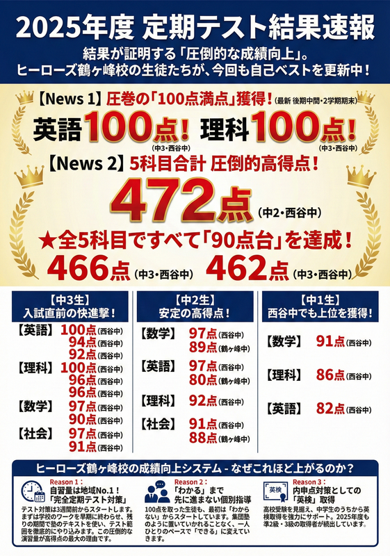 先日の大学合格速報に続き、本日は中学生たちの頑張りをご報告します! 近隣の西谷中学校、鶴ヶ峰中学校、本宿中学校で行われた「2学期期末テスト・後期中間テスト」の結果が出揃いました。